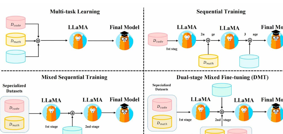 混合顺序训练:首先在特定能力数据集(代码、数学)上进行多任务学习,然后在通用能力数据集上进行 SFT;