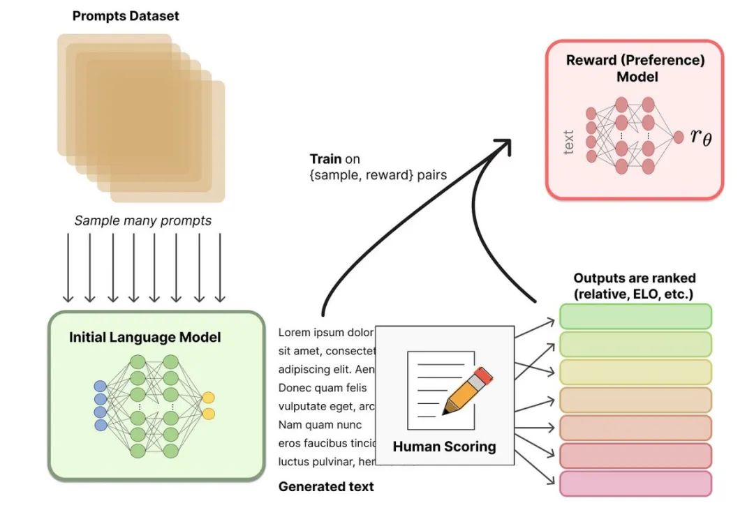 训练数据:奖励模型的训练数据通常来源于人工标注的对比数据集。标注者需要根据预设的标准(如准确性、有用性、流畅性等)对多个输出文本进行排序或分类。