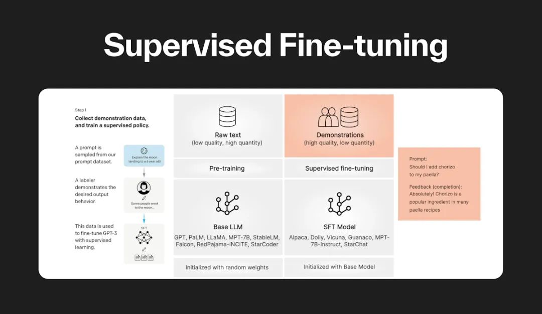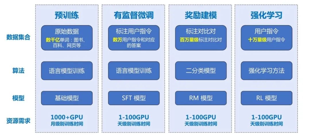 资源:相比预训练阶段,有监督微调所需的计算资源较少,通常只需要数十块GPU,并在数天内完成训练。