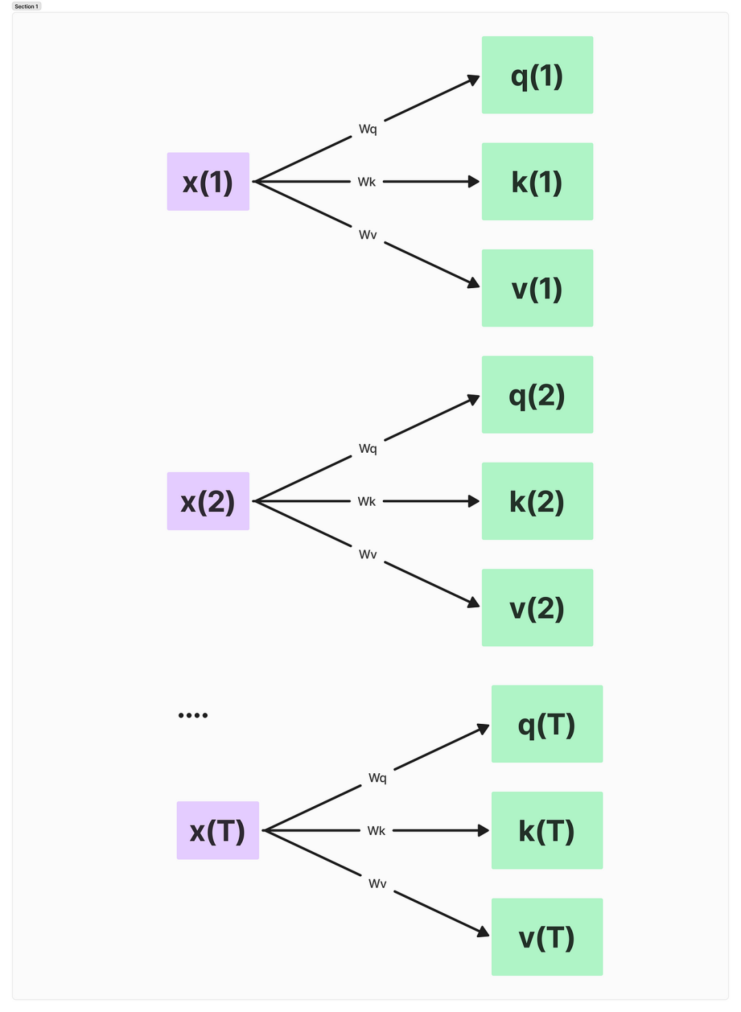 这个操作实际上是将每个输入token x(i)投影到这三个不同的空间中。