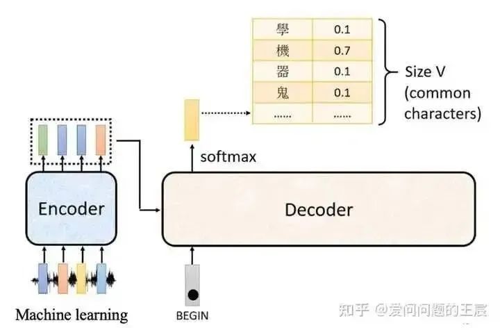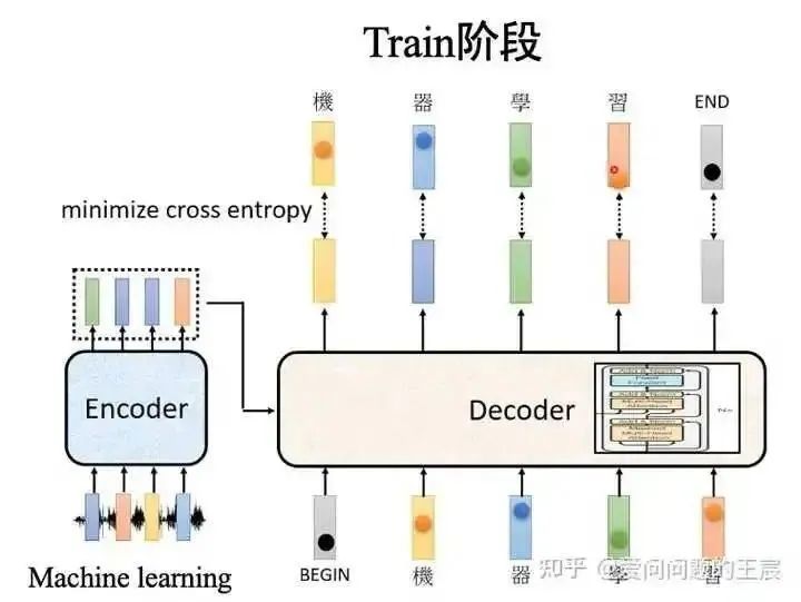 在Train阶段,如图8所示。这时是知道label的,decoder的第一个输入是begin字符,输出第一个向量与label中第一个字符使用cross entropy loss。Decoder的第二个输入是第一个向量的label,Decoder的第N个输入对应的输出是End字符,到此结束。这里也可以看到,在Train阶段是可以进行并行训练的。