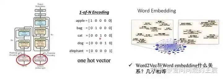 图13 Embedding的一些说明,从左往右依次为:embedding在Transformer中的位置,one hot vector,Word embedding。