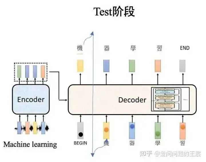 在Test阶段,下一个时刻的输入时是前一个时刻的输出,如图9所示。因此,Train和Test时候,Decoder的输入会出现Mismatch,在Test时候确实有可能会出现一步错,步步错的情况。有两种解决方案:一种是train时偶尔给一些错误,另一种是Scheduled sampling。
