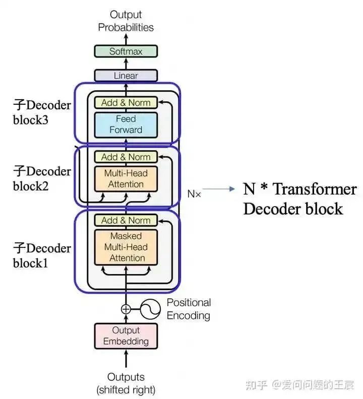 5.2 从结构角度,如图6所示,Transformer Decoder = Embedding + Positional Embedding + N*(子Decoder block1 + 子Decoder block2 + 子Decoder block3)+ Linear + Softmax;