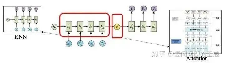 2.2 技术背景层面:(1)当时主流的序列转录任务(如机器翻译)的解决方案如下图3所示,在Sequence to Sequence架构下(Encoder- Decoder的一种),RNN来提取特征,Attention机制将Encoder提取到的特征高效传递给Decoder。(2)这种做法有两个不足之处,一方面是在提取特征时的RNN天生从前向后时序传递的结构决定了其无法并行运算,其次是当序列长度过长时,最前面序列的信息有可能被遗忘掉。因此可以看到,在这个框架下,RNN是相对薄弱急需改进的地方。