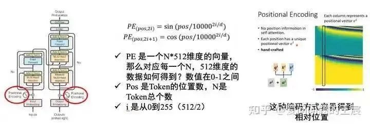 图14 Positional Embedding的一些说明,从左往右依次为:positional embedding在Transformer中的位置,传统位置编码的实现方式,传统位置编码ei得到的图像,每一列为一个token的位置编码。