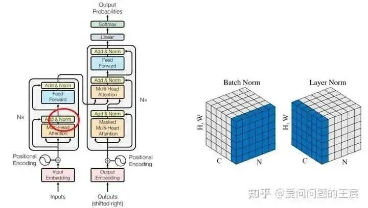 图28 layer Normalization在Transformer架构中的位置(左)与batch normalization的区别(右)