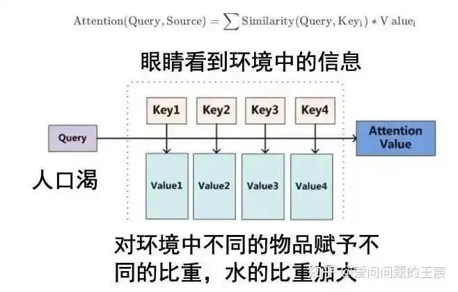 那么什么是QKV呢?Q是query,K是keys,V是values。如图17所示,举例而言,Q是大脑发出的信号,我口渴了;K是环境信息,眼睛看到的世界;V是对环境中不同的物品赋予不同的比重,水的比重加大。