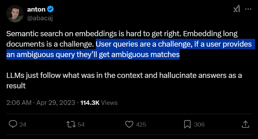 但是我们不能指望所有的用户都能清楚地描述自己的 Query,如果用户写了一句模棱两可的 Query 或者是一个复杂的 Query,那么检索到的文档也将是模棱两可或者难以准确检索,进而导致 LLM 的回答就不准确: