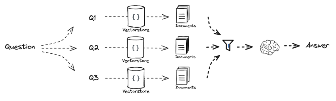 这个过程与 Multi-Query 很相似,但是对检索到的多篇文档进行筛选过滤之后再输入 LLM: