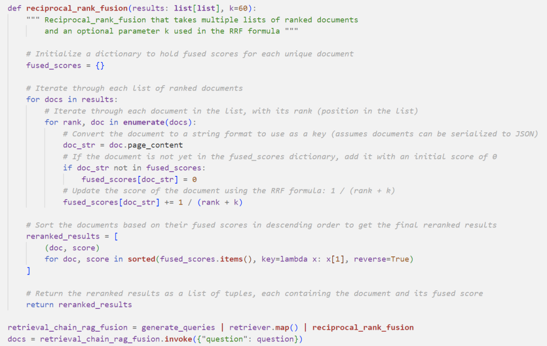 这里我将实现一个简单的 Reciprocal Rank Fusion (RRF) 检索过滤方法: