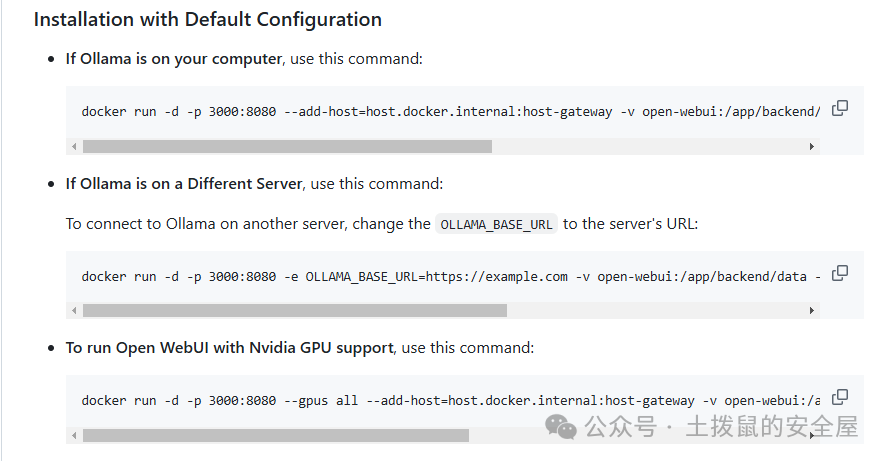 首先,进入open-webui主页https://github.com/open-webui/open-webui,找到下载链接。由于我们已经安装过Ollama,所以可以选择第一条指令,点击右侧的复制: