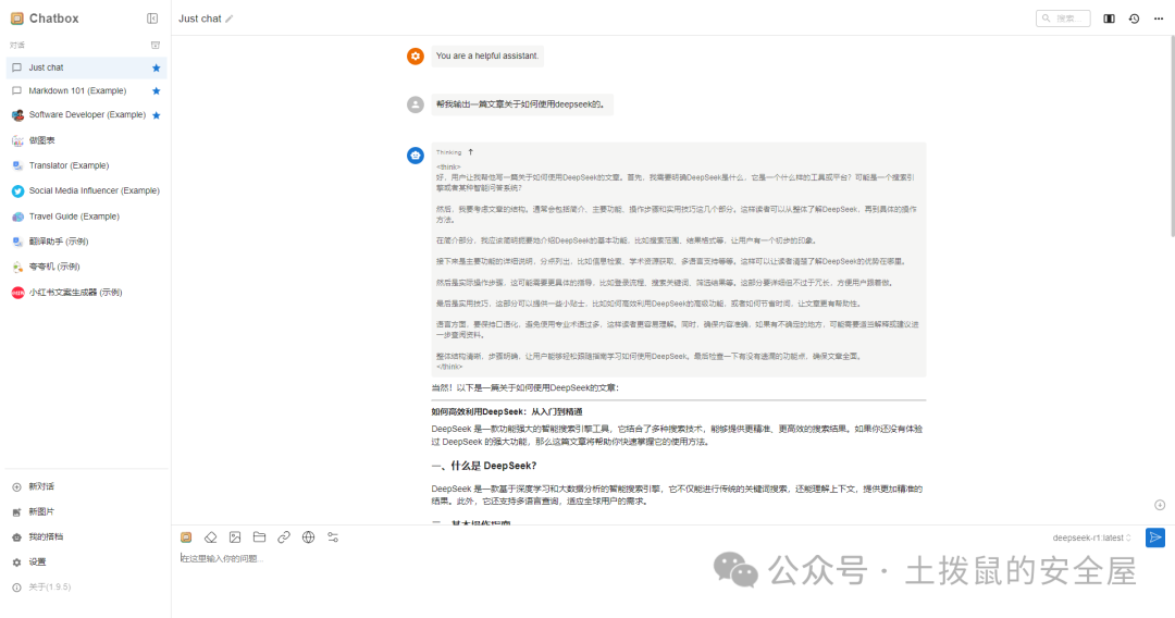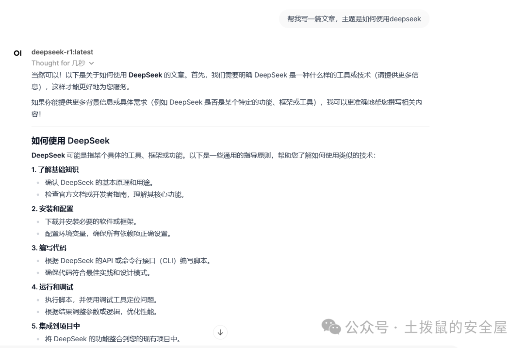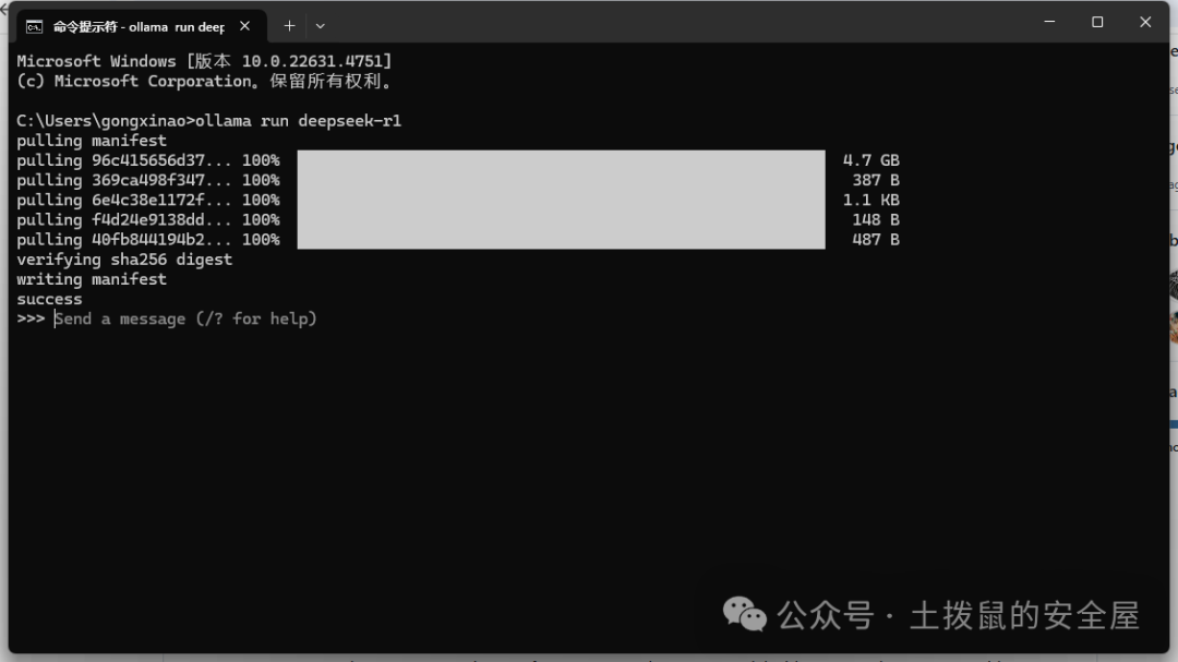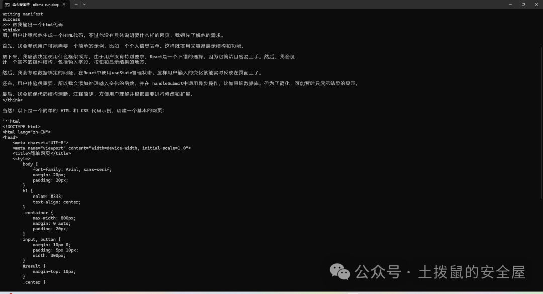 下载完模型以后,直接进入对话界面,可以直接在命令行对话聊天,标签内是深度思考的内容:
