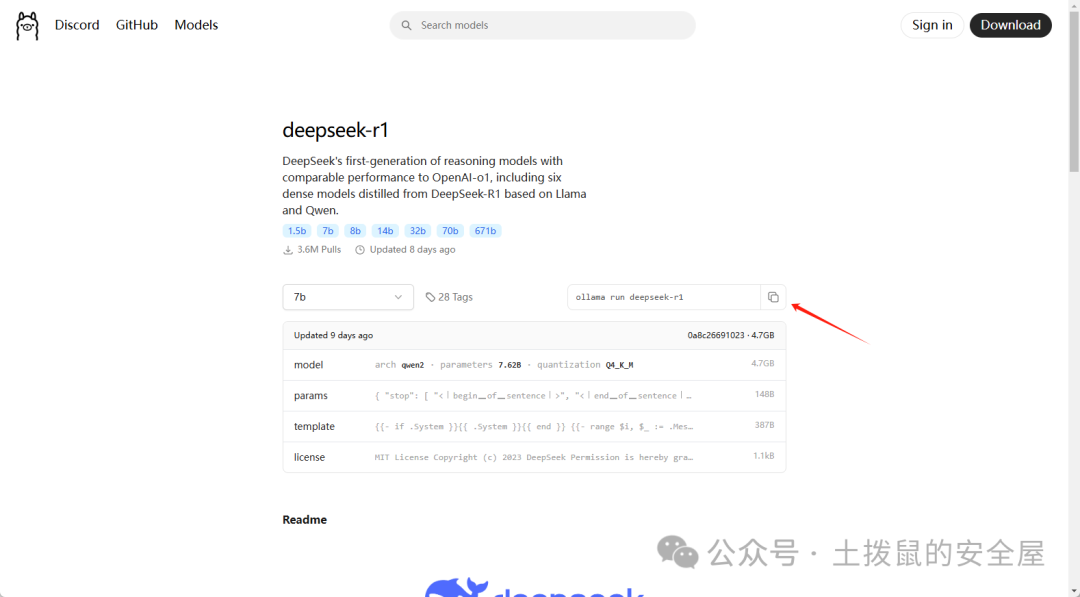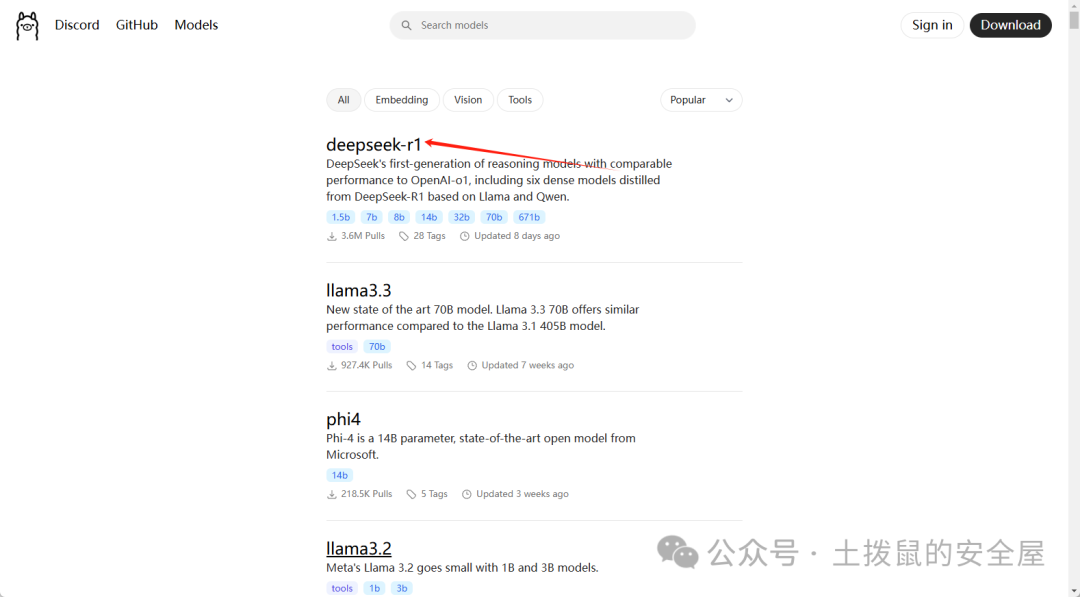 进入Ollama官网,找到Models标签,可以看到第一个就是DeepSeek-R1: