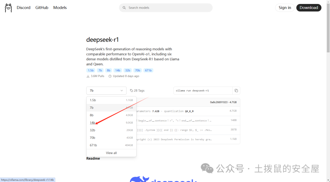 点进去以后,可以在下方选择模型的参数规模,每个模型右边则是模型的大小,如果是8g的显卡,可以选择7b或者8b的模型。这里以3060 12g为例,下载14b的模型: