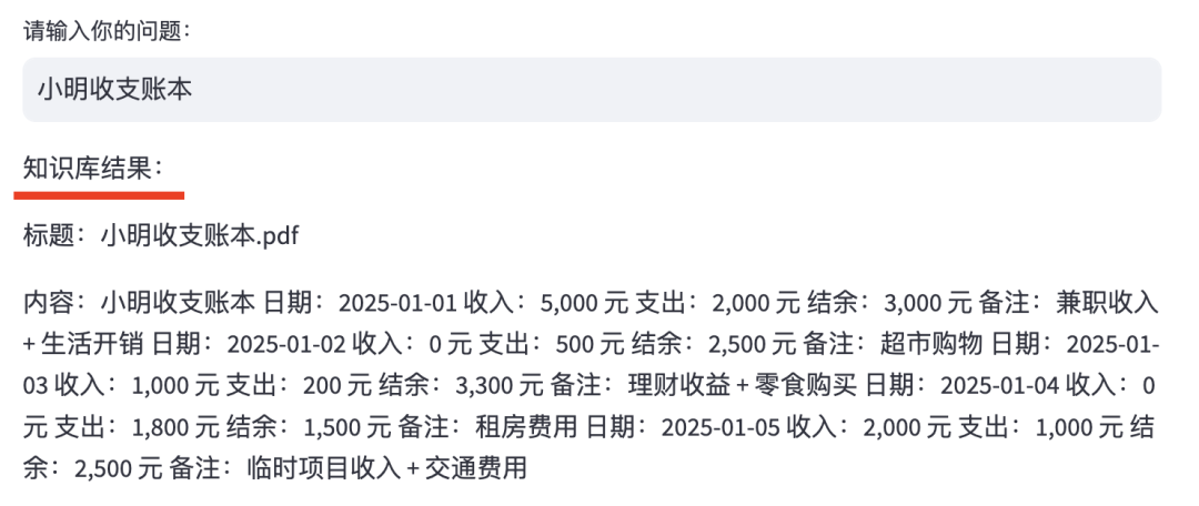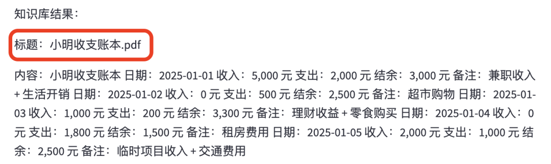 等输入「小明收支账本」关键词时,很快就能从本地知识库检索到,如下所示。此处代码使用了模糊查询,所以命中概率会大幅提升: