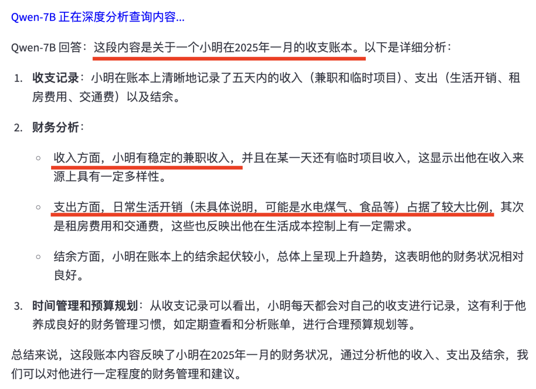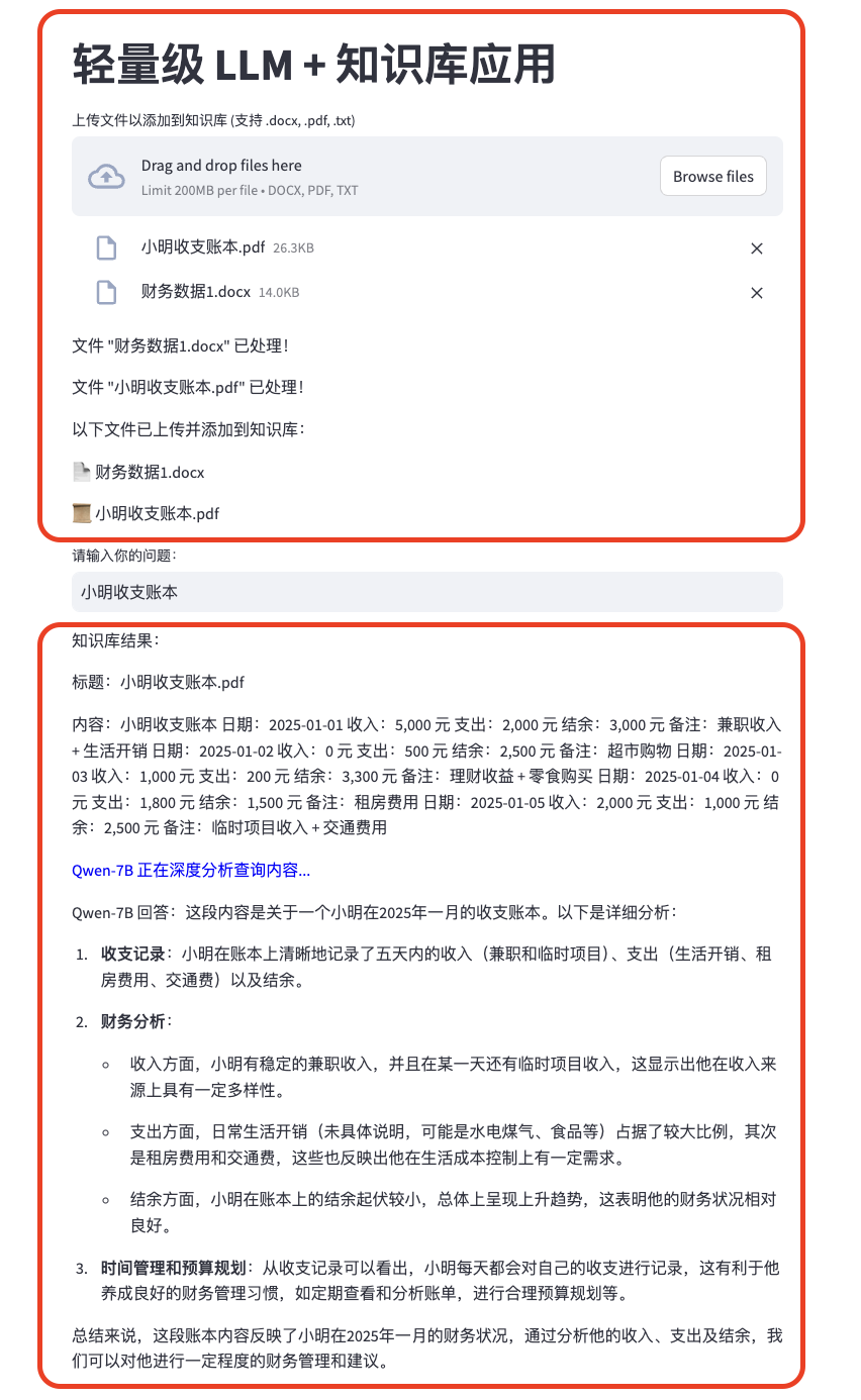 3 大模型辅助分析:比如搜索“小明收支账本”,系统会自动检索相关内容,还能用大模型给出智能总结,堪称你的私人助理。