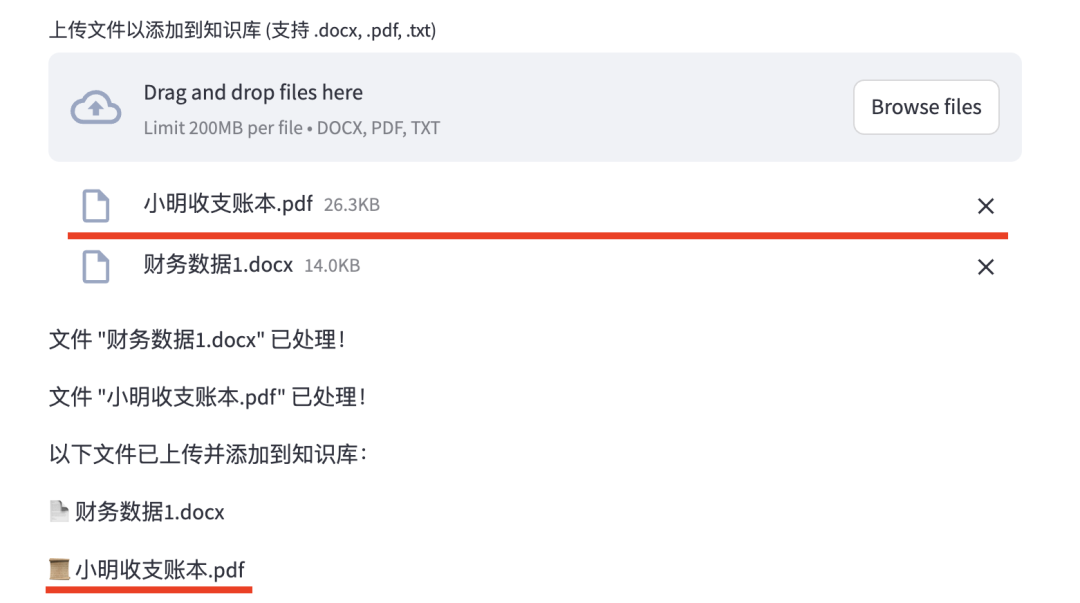 再次拖动小明收支账本.pdf到界面,加载后自动显示已处理,因为是在本地进行,并且使用了whoosh检索工具,加载速度非常快:
