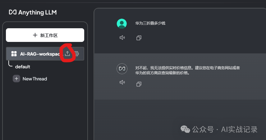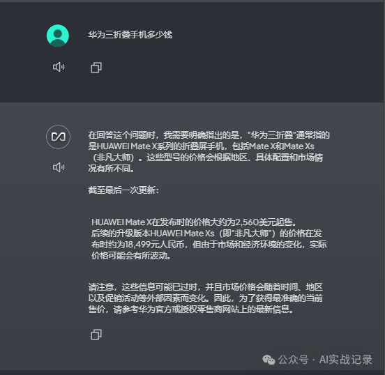 接下来开始导入数据。在导入数据之前,我先问一下AI,华为三折叠手机多少钱,AI回复不知道。那我们把华为的官网数据提供给它。