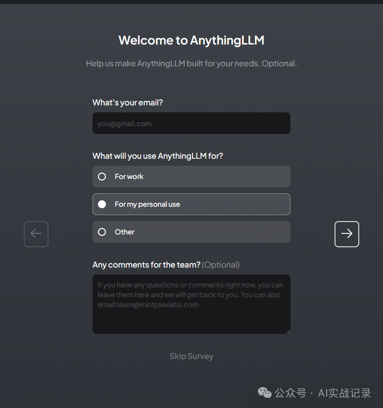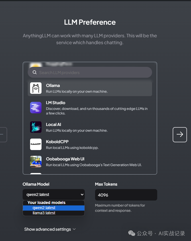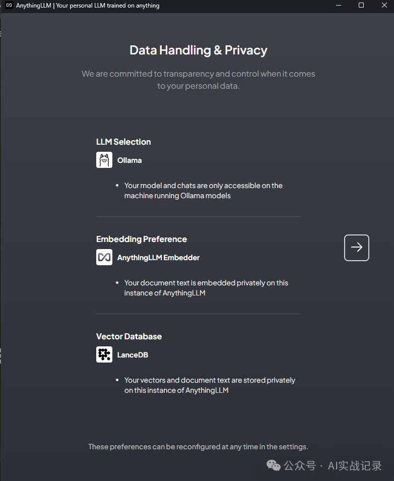 安装完成之后,双击桌面上的 AngthingLLM图标,启动该工具,第一次启动估计需要几分钟的加载时间,请耐心等待,页面打开之后,系统首先会让你选一个开源模型(免费的Ollama),也可以使用商用的闭源模型(需要花钱买的,比如OpenAI,花钱的肯定比没花钱的好),这里我们就选免费的Ollama。