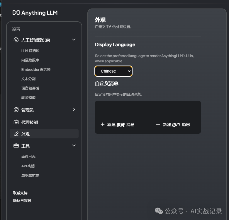 在左侧栏的底部有一排操作按钮,点击最后一个小扳手,进入设置页面,在这个页面可以修改向量数据库(如果不太懂,保持默认即可),和设置语言(chinese)