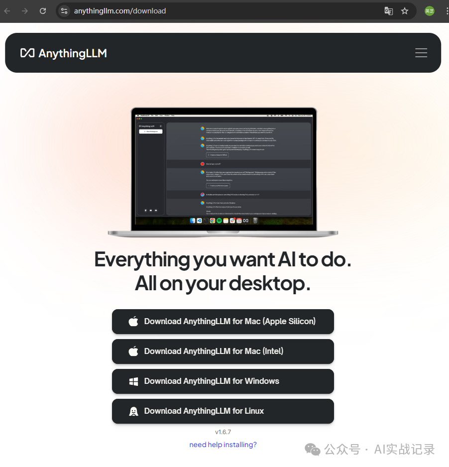 根据你的系统来选择合适的安装包https://anythingllm.com/download