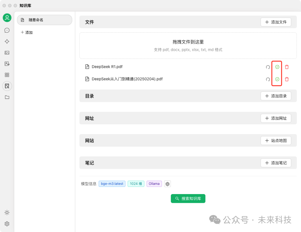 我们先加一两个文档试试,可以看到加入后,每个文档都会经过嵌入模型的处理,有个蓝色小点loading过程,如果看到绿色小勾,就代表这个文档可以被deepseek检索到了。