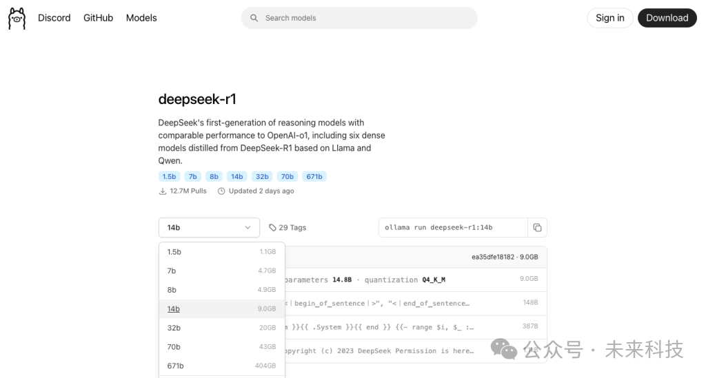 拓展阅读: 更多尺寸的模型下载命令可以在这里找到:https://ollama.com/library/deepseek-r1