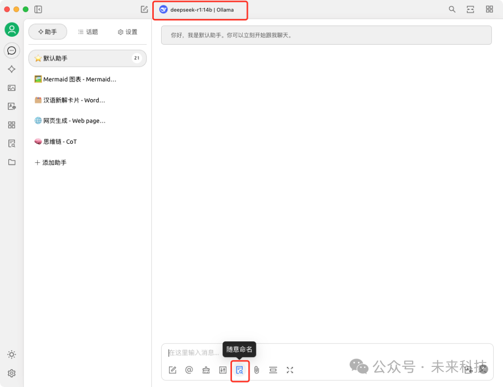 好啦,现在你电脑上的DeepSeek-R1就拥有了知晓你私人文档的知识库:回到聊天界面,顶部选择deepseek-r1:14b|Ollama这个模型,输入框下方知识库按钮选中刚才创建的知识库,现在试试询问一个DeepSeek本身不知道的问题——
