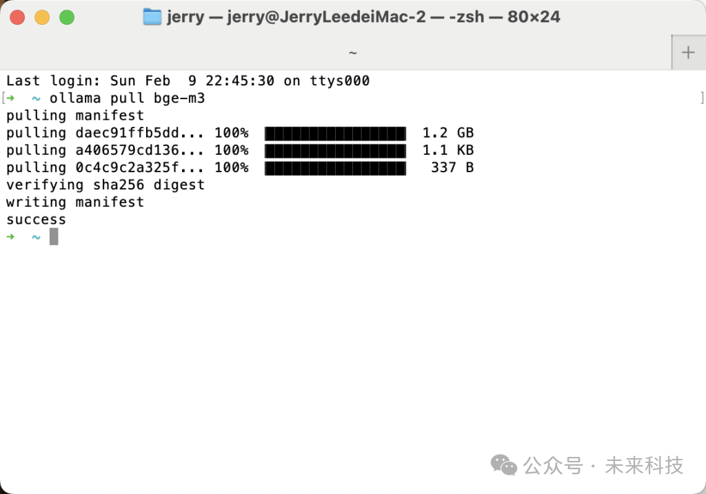 等待下载完毕,看到success,关闭终端就行了。embedding嵌入模型的作用是把知识库里的文档内容转化为便于搜索的向量,这里只需要理解它是用来处理知识库文档数据的即可。
