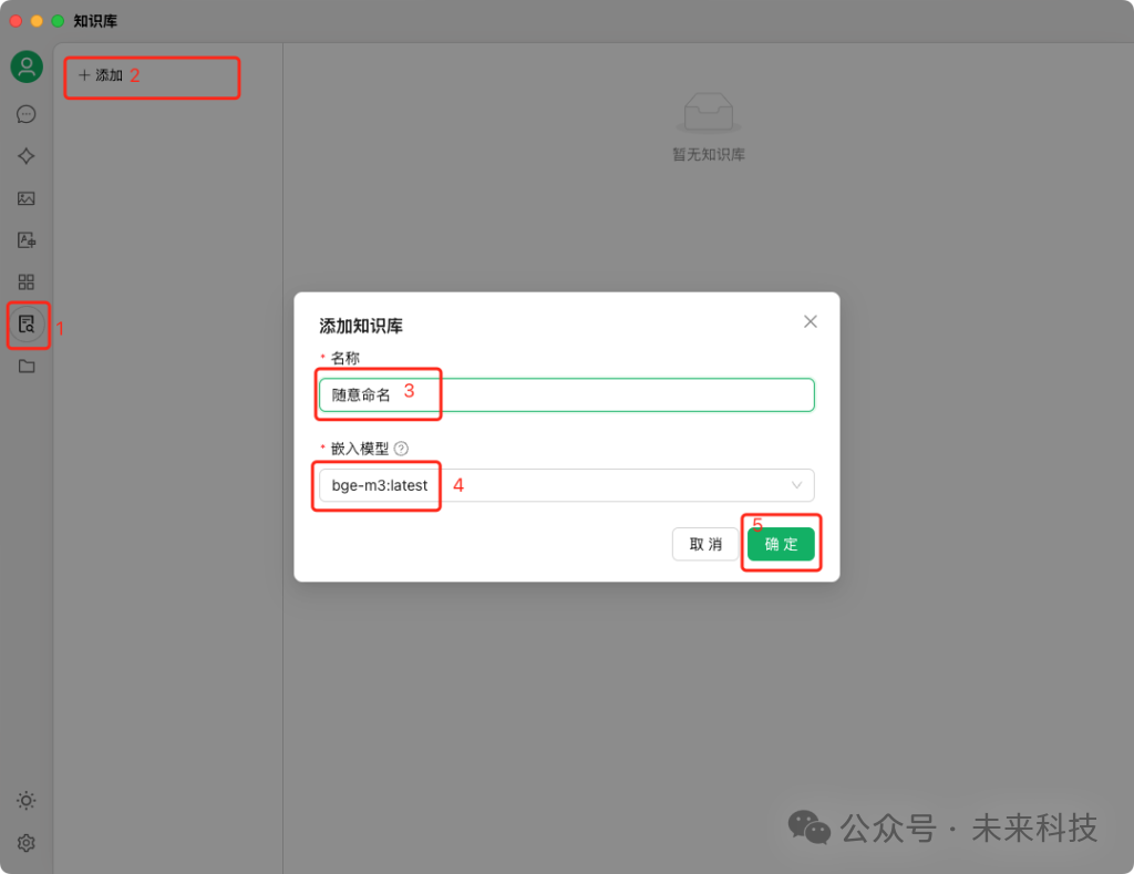 点击Cherry Studio左侧的知识库按钮,再点击“添加”,给知识库取个名字,嵌入模型选择我们刚才下载的bge-m3,点击确定后,即可创建出一个知识库。