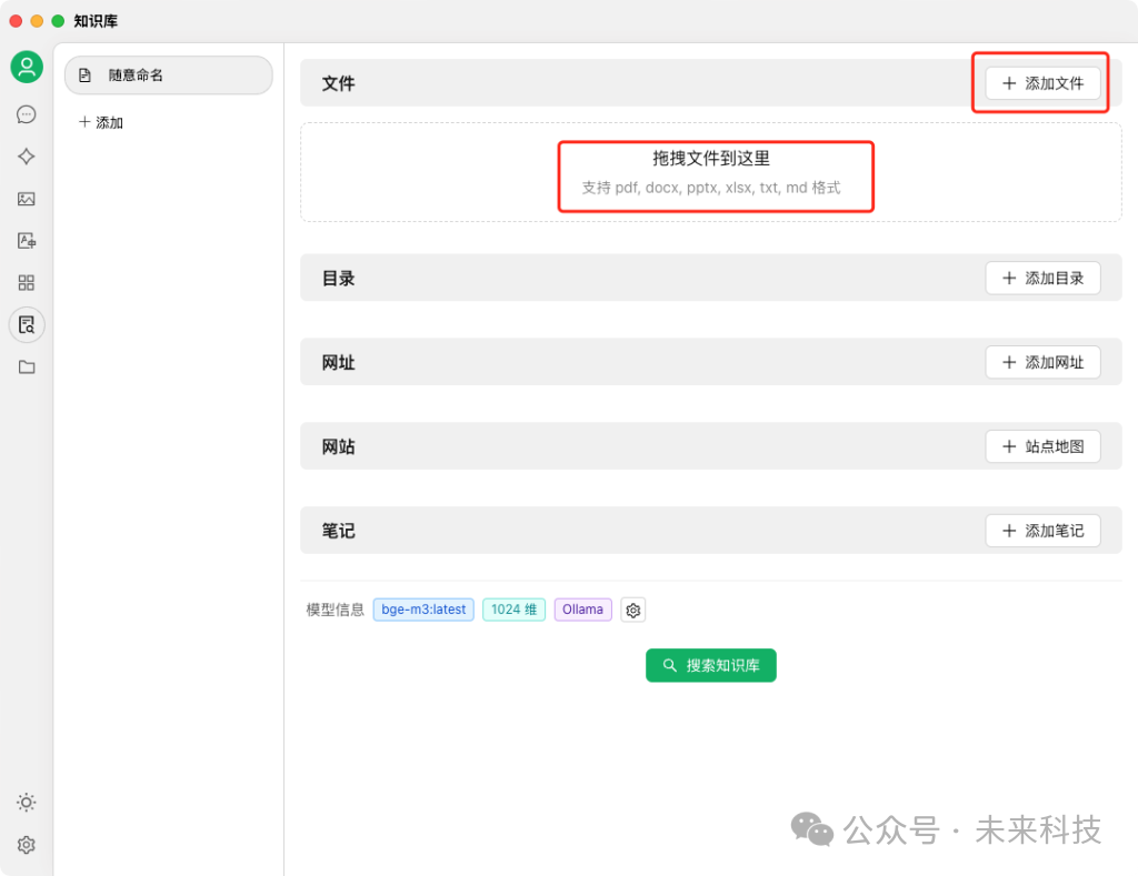 这时可以添加文件或者直接拖拽文件到知识库里,支持pdf、docx、pptx、txt等格式,把个人简历、日记、工作文档、甚至微信聊天记录(前提是手动导成文本)放进来都可以。