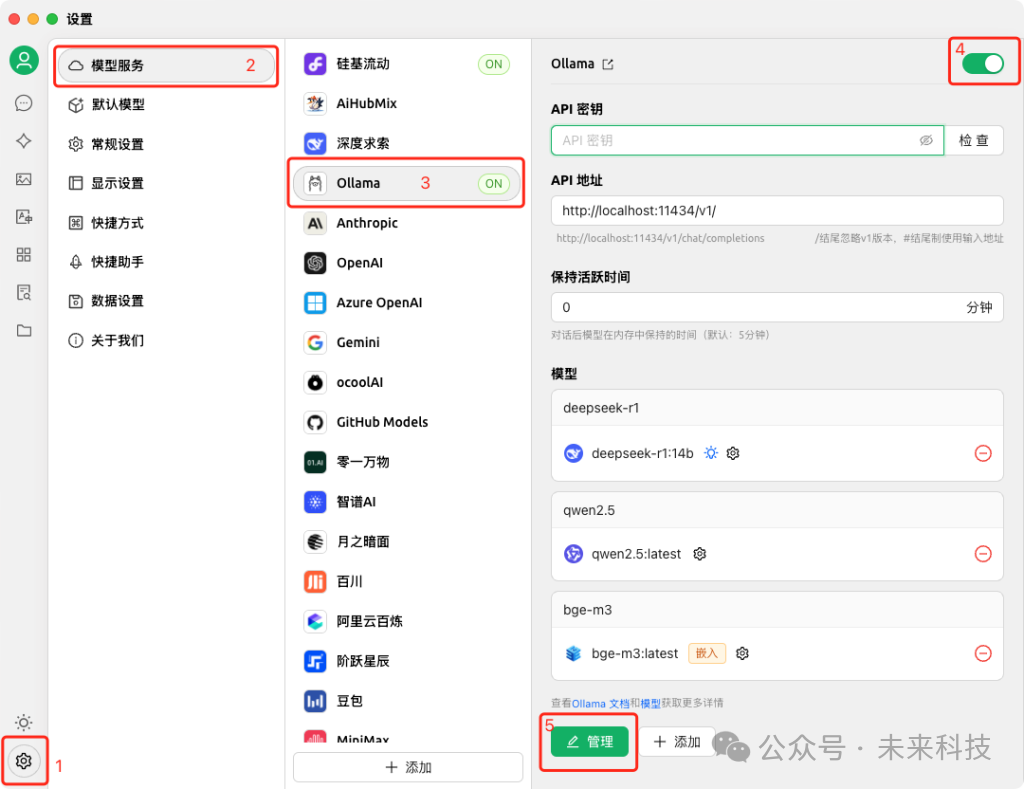 启动Cherry Studio,依次点击左下角设置-模型服务-Ollama,开启Ollama,API地址保持默认,点击管理按钮,可以看到会自动读取到我们刚才下载的deepseek-r1:14b和bge-m3[嵌入] 两个模型,点击添加。