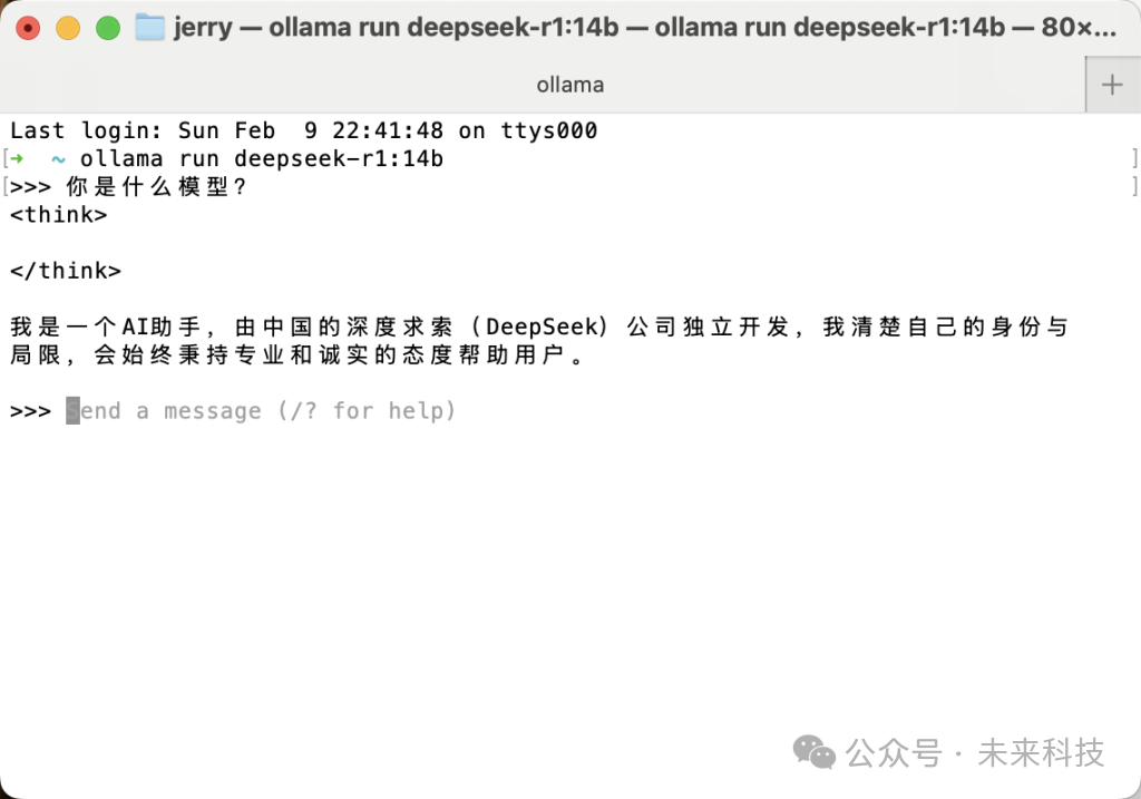 这里我选择了我的设备能运行的最大尺寸的模型,14b参数的这个。打开终端,输入命令:ollama run deepseek-r1:14b