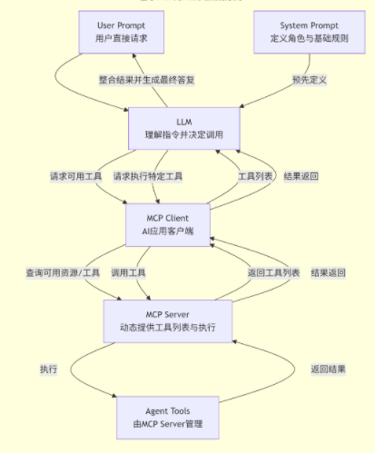 在传统方式中,所有工具必须提前预设在系统提示词System Prompt中,LLM通过Function Calling机制决定要调用哪个工具以及参数是什么,AI Agent接收到LLM的结构化调用请求后,在本地调用相应的Agent Tool工具并返回结果给AI Agent,进而将结果返回给LLM,待LLM整合信息思考后给出回复。