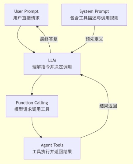 以下将从传统的工具调用方式和MCP工具调用方式来分别说明System Prompt、agent tools、user prompt、function calling、ai agent之间的调用关系,以便深入了解其异同: