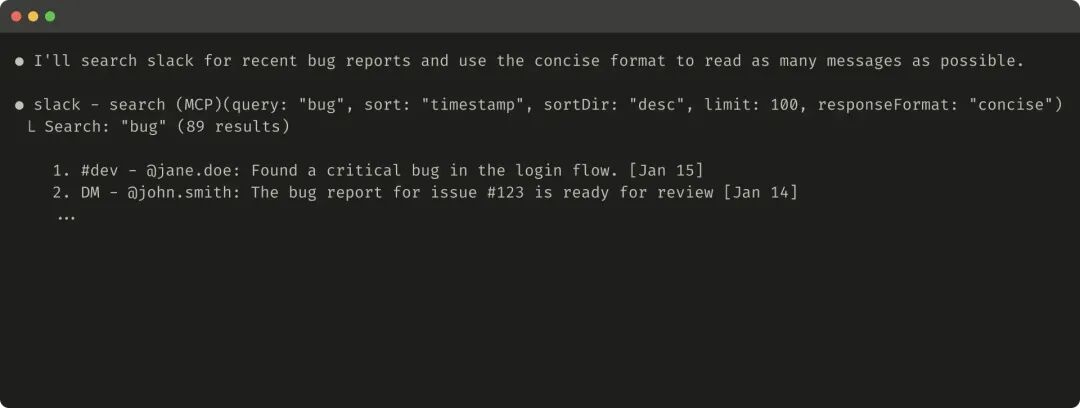 此外,在某些场景下,代理可能需要同时与自然语言和技术标识符进行交互,例如,为了触发下游的工具调用。一个具体的例子是:search_user(name='jane') → send_message(id=12345)。为了支持这种需求,可以在工具中引入一个简单的 response_format 枚举参数,允许代理自主选择工具返回的信息粒度,例如 “concise”(简洁)或 “detailed”(详细)的响应。