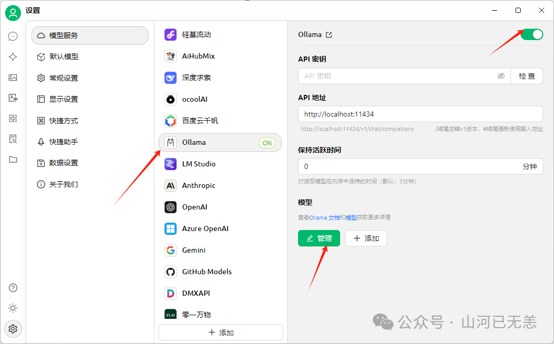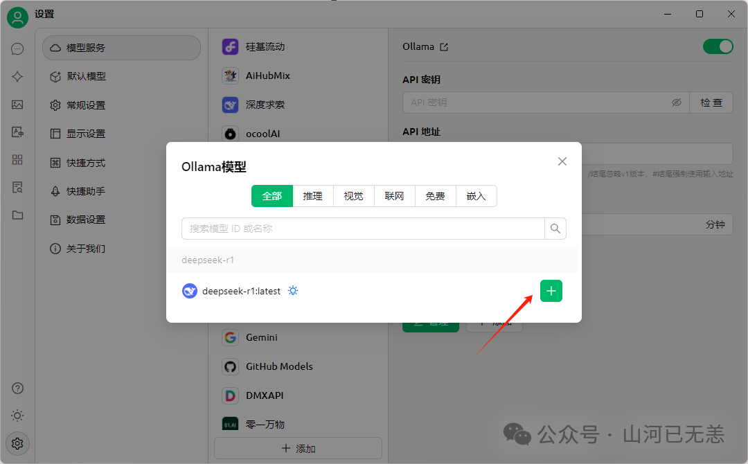 设置图标选择模型服务,选择本地的 ollama 服务,