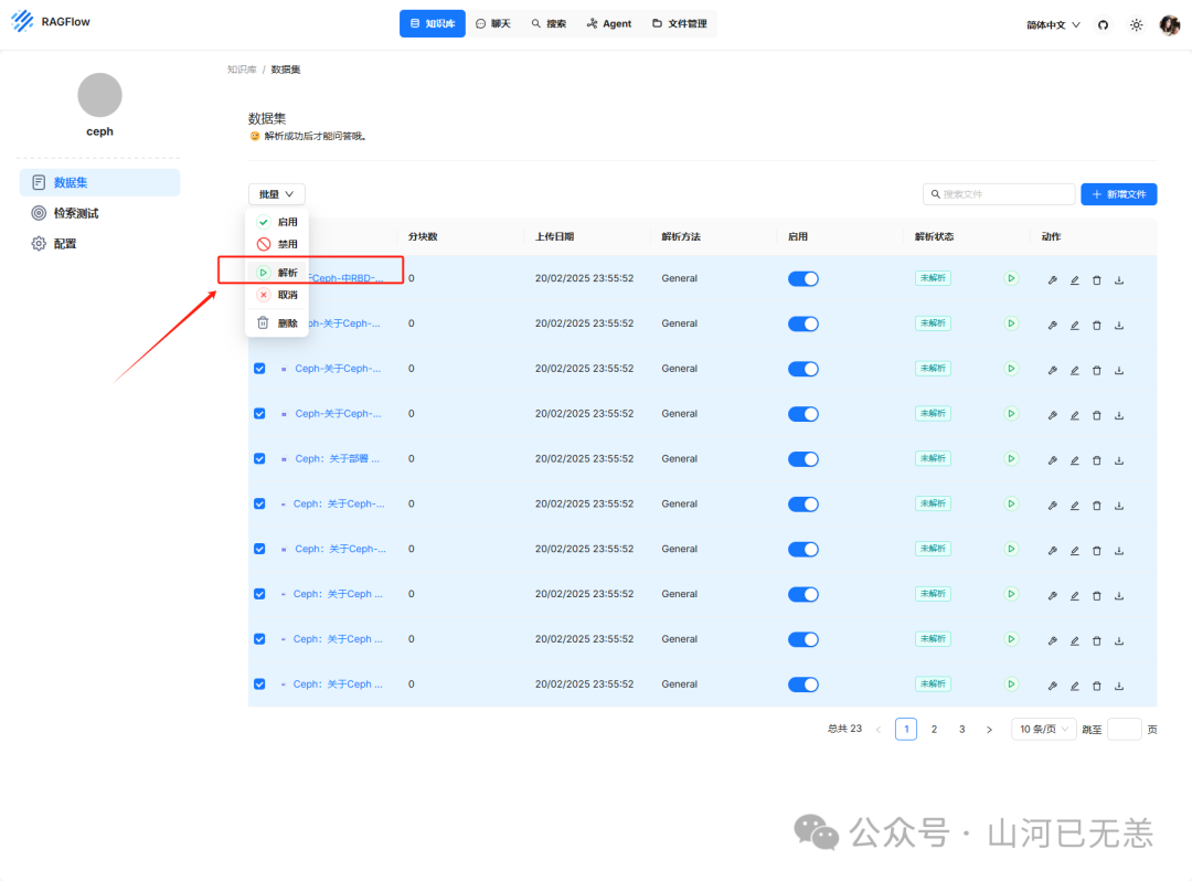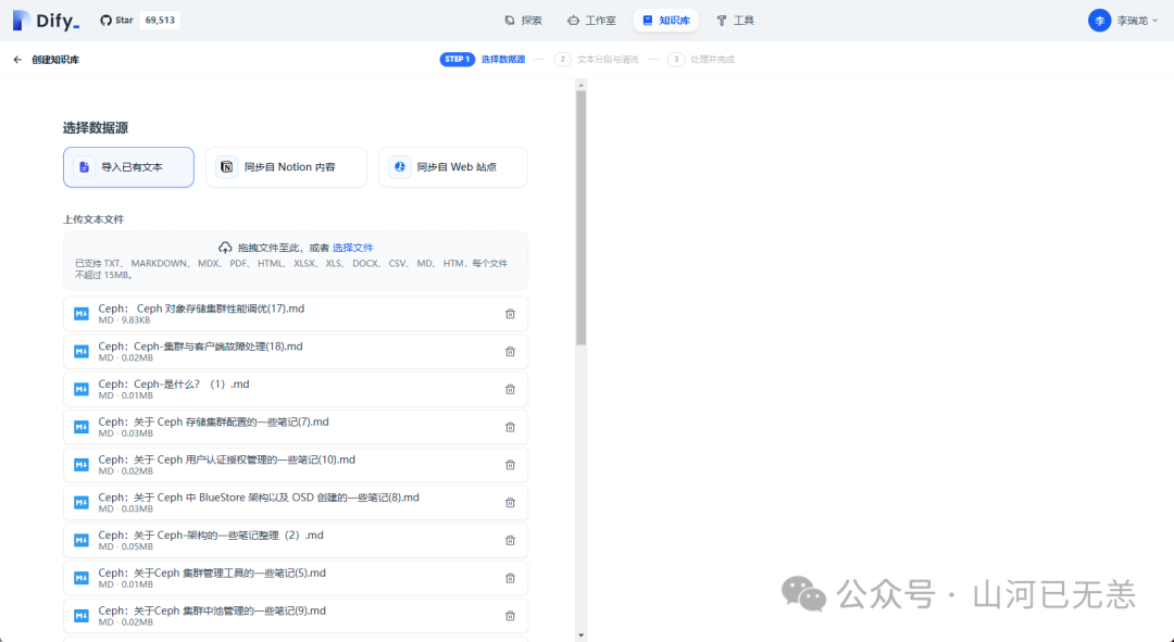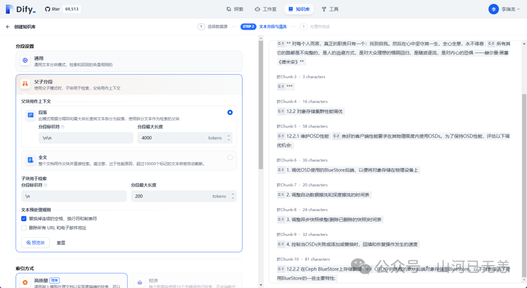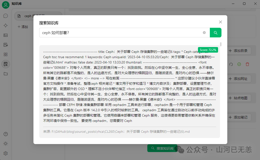 然后上传要创建知识库的文件,可以通过搜索知识库简单测试
