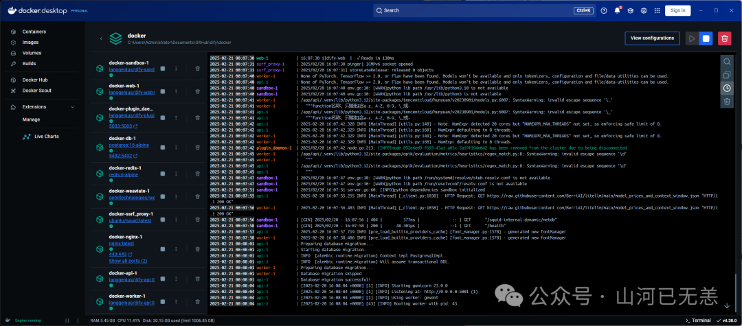 部署成功之后可以在docker 桌面版中看到容器,核心服务是一个 server