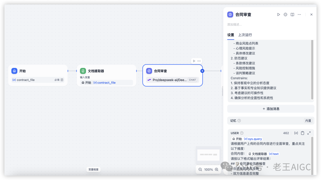 🚀 开始节点📄 文档提取器🤖 LLM合同评审📊 输出优化
