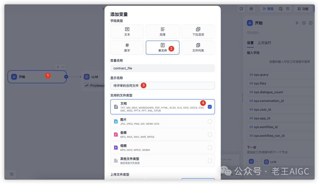 - • 设置"对话开场白":“您好!我是智能合同评审助手,请上传您需要评审的合同文件(支持docx格式)”