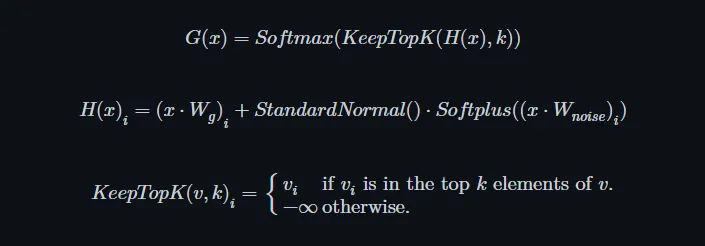 - 门控网络:一个小型网络(通常是单个线性层+softmax),将每个输入映射到一个关于n个专家的分数向量**g(x)∈R^n**。softmax门控输出密集分布,而稀疏门控添加了使大多数条目为零的机制。Shazeer等人使用**带噪声的Top-k门控**:向每个门控分数添加高斯噪声,然后只保留top-k值(其他设为零)。噪声有助于探索和平衡(防止单个专家占主导地位)。在实际中,k通常是1或2(例如Switch使用top-1),这意味着每个输入被路由到1-2个专家。
