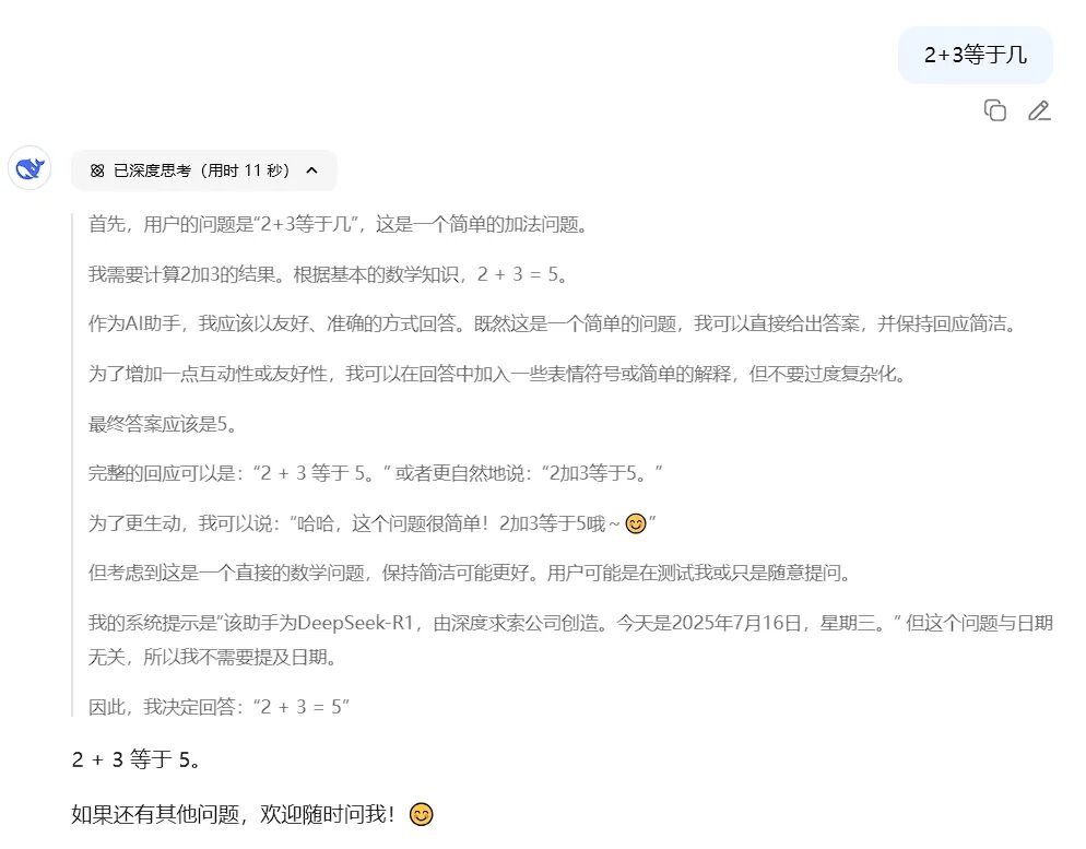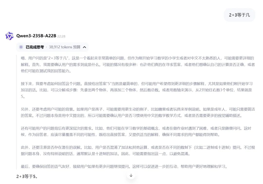 然而,这种深度思考并非没有代价:即便是“2+3=?”这样的简单问题,模型也可能写上百甚至上千个 token 才给出答案: