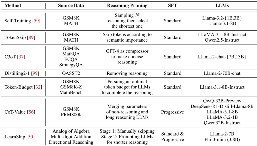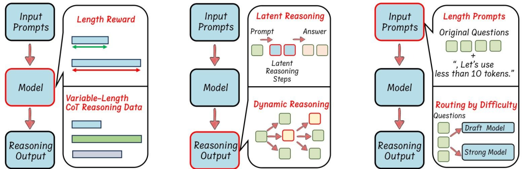 - 输出层面:通过压缩潜在推理步骤或动态控制推理范式,在推理过程中直接减少冗余步骤。