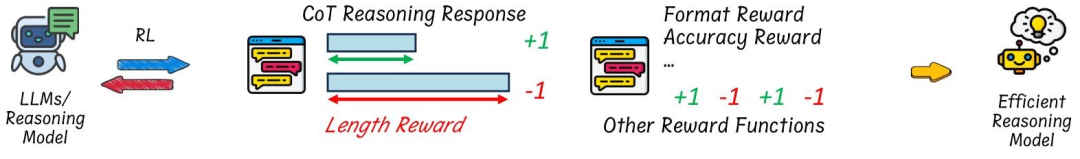 做法是在 RL 的回报里同时编码正确性与长度:鼓励“短且对”,惩罚“长且错/冗余”,以抑制过度思考(下图示意)。实践中常搭配格式/过程奖励,避免模型靠删字取巧。