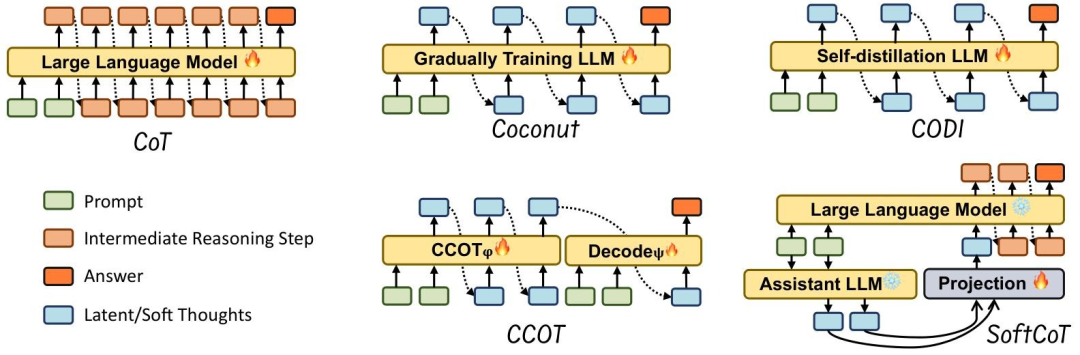 - SoftCoT:不改动主 LLM,单独训练一个小网络生成若干连续思维向量,再通过线性变换投影到主模型的嵌入维度,把它们当作前缀软 token拼到输入前;主模型据此进行更多内部计算,而无需输出冗长 CoT。