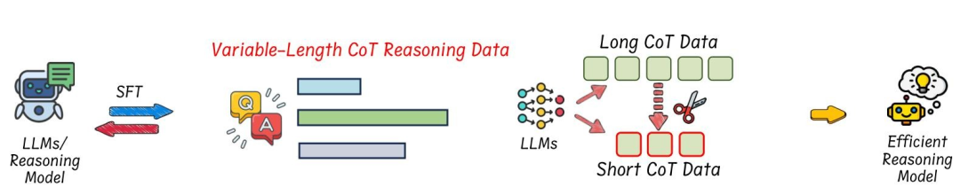 即先获得长+短并存的 CoT 数据,再做 SFT 让模型学会“该长则长、该短则短”的表达。
