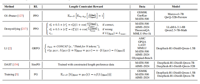 总体而言,通过设计RL中的长度奖励,能在不显著牺牲准确度的前提下有效缩短CoT长度。这种方法的难点在于确定不同的任务的合理推理长度,进而设计出合理的长度奖励。