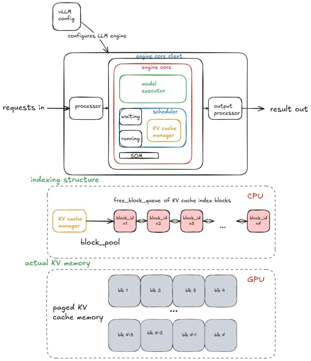 - KV 缓存块(blocks):vLLM 采用 “分页式注意力”(PagedAttention),将 KV 缓存分割为固定大小的块(类似操作系统内存分页),便于动态管理(如复用、回收)。